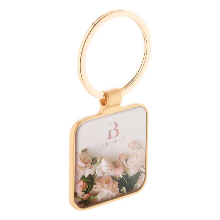 Square shaped metal keyring in golden finish with gunmetal plate. In kraft paper box.