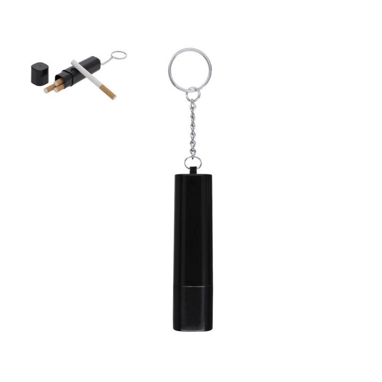 Practical keychain case for tobacco with a compact design, ideal for comfortable transport. It holds four cigars and features a removable metal lid and keyring.