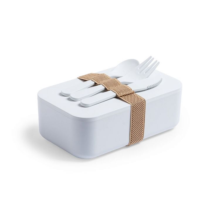 Nature line lunch box, made of 100% compostable PLA, BPA free. 1L capacity, including safety belt with fork, spoon and knife. Presented in an individual bag. Product made of PLA material, from renewable raw materials, with important properties such as versatility and resistance, highlighting among them the compostability. (white color)