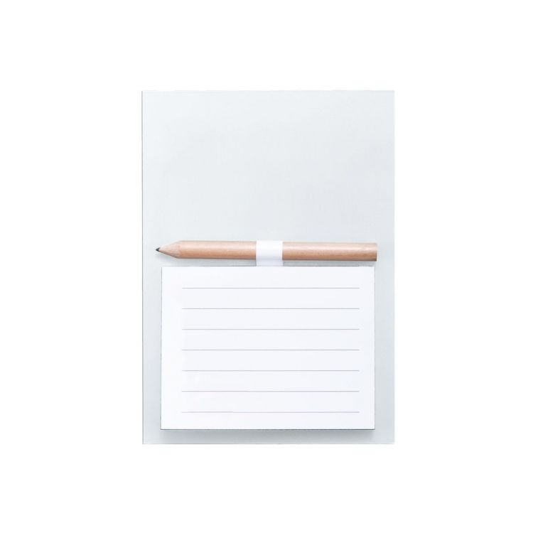 Magnet notepad in resistant cardboard of bright and varied colors. 40 sheets with striped design, with pencil and holder.