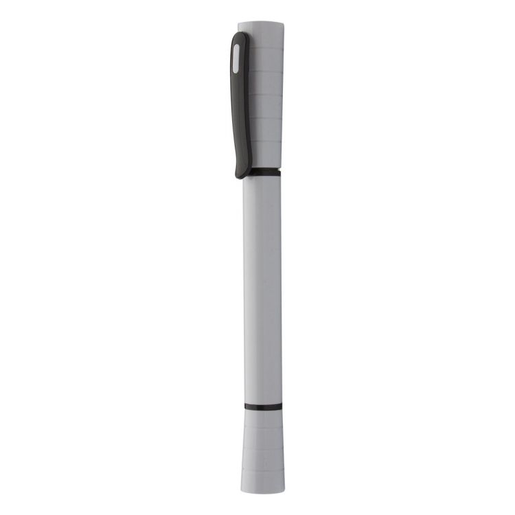 Plastic ballpoint pen with LED flashlight. Delivered with blue refill and button cell batteries, in white color