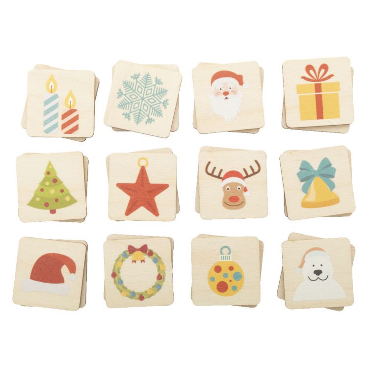 Laminated birch plywood memory game with Christmas motives. With 24 tiles (40x40 mm). Price includes an identical full colour logo print on backside of all tiles. MOQ: 50 pcs