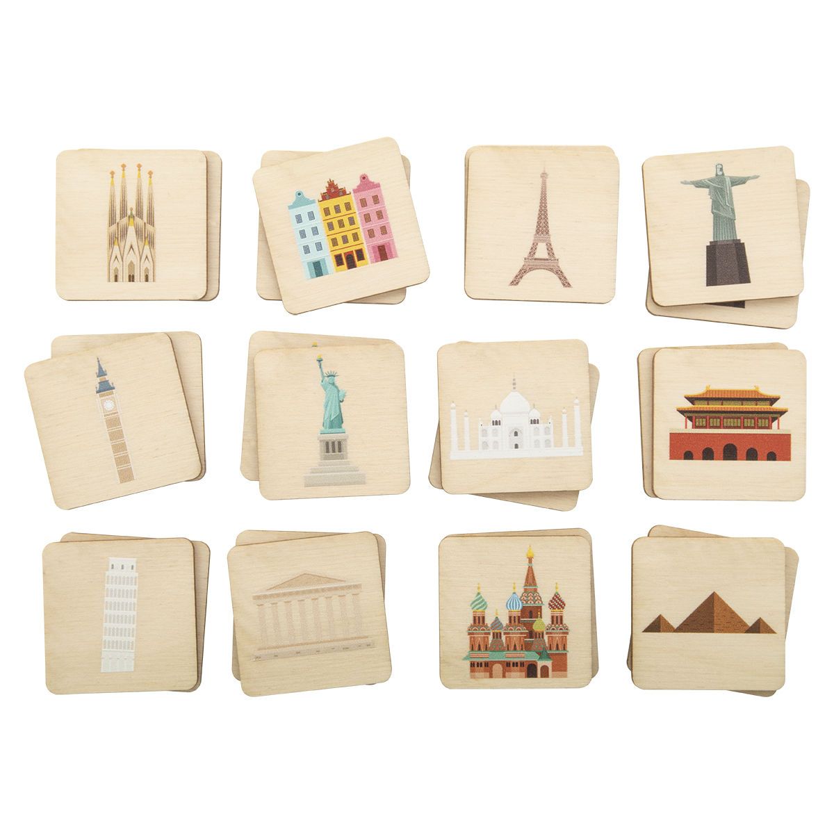 Laminated birch wood memory game with thematic motives. With 24 tiles (40x40 mm). Price includes 1 colour logo print on backside of all tiles. MOQ: 50 pcs