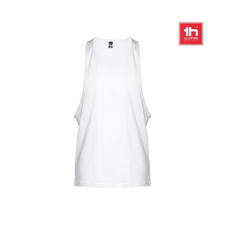 100% cotton men's sleeveless jersey (140 g/m²) with carded cotton yarn. Wide armholes and round collar, with bias tape on the armholes and neckline. Piece cut and sewn with double seam at the hemline