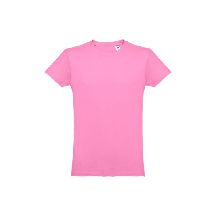 Tubular t-shirt for men with a regular cut in jersey 100% cotton (150 g/m²) with carded cotton yarn (colour 183: 90% cotton/10% viscose). Features a 1x1 rib collar with jersey reinforcement ribbon and double seam on sleeves and hemline. Product in light pink color, size S