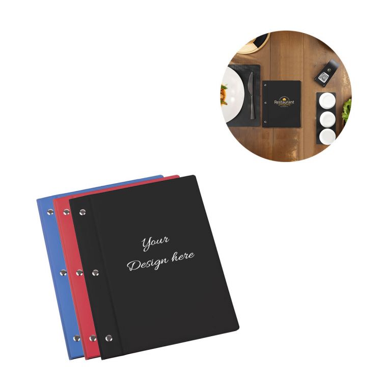 Medium two-door menu holder made of hardback PVC on the outside and leatherette on the inside. The item has a wide rib which includes 3 holes prepared for the visible mounting screws, supplied disassembled, and includes 10 PPL envelope bags with universal hole (disassembled)