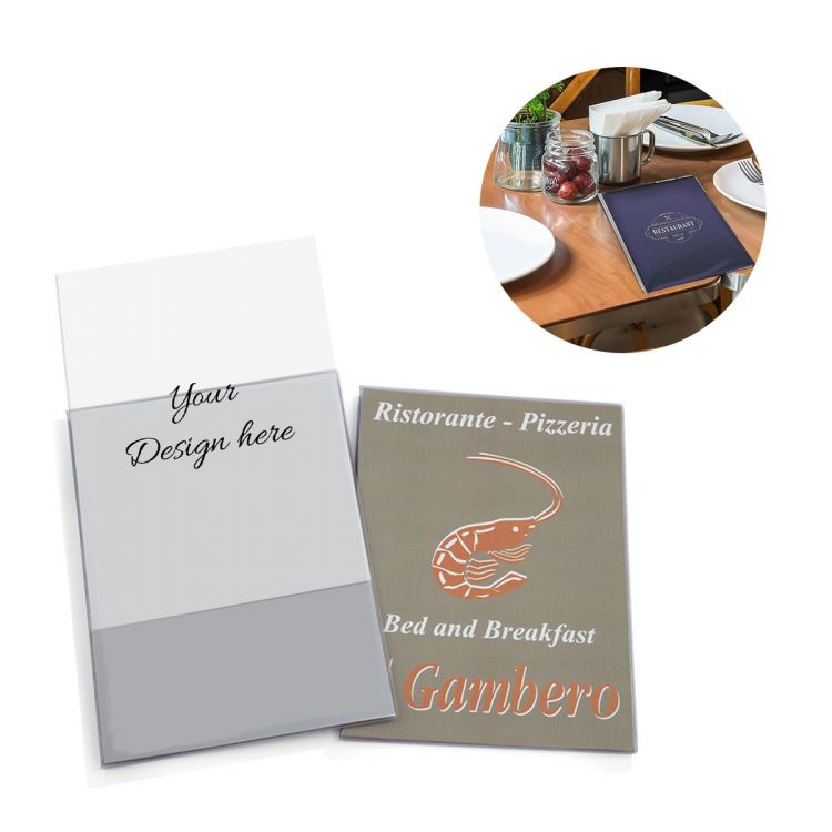 double sided maxi menu holder with transparent PVC cover with four-colour customised cardboard inserts welded on the two outer sides. Inside, 2 pockets and 4 transparent PVC envelopes with top opening for inserting paper inserts.