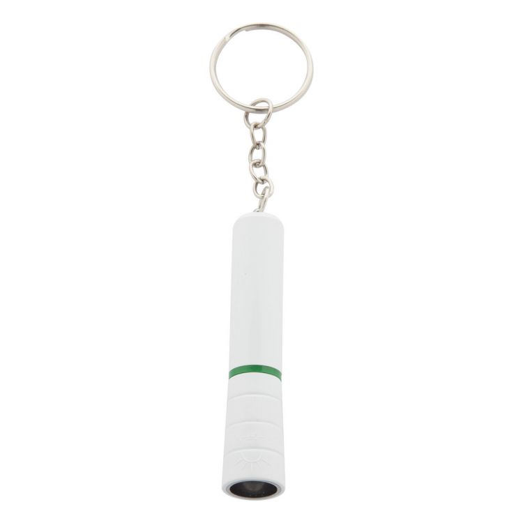 Plastic, mini flashlight with 1 LED and metal keyring. With button cell battery.