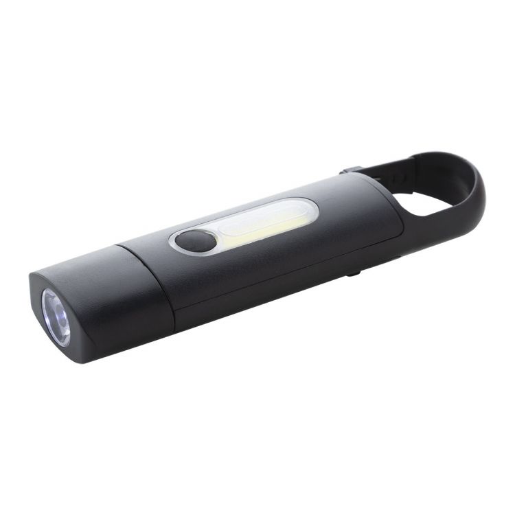 Recycled ABS mini flashlight with built-in USB rechargeable battery (200 mAh) and carabiner. With COB light at the font and COB floodlight on the side. With 3 light modes. Including USB charger cable, in black color