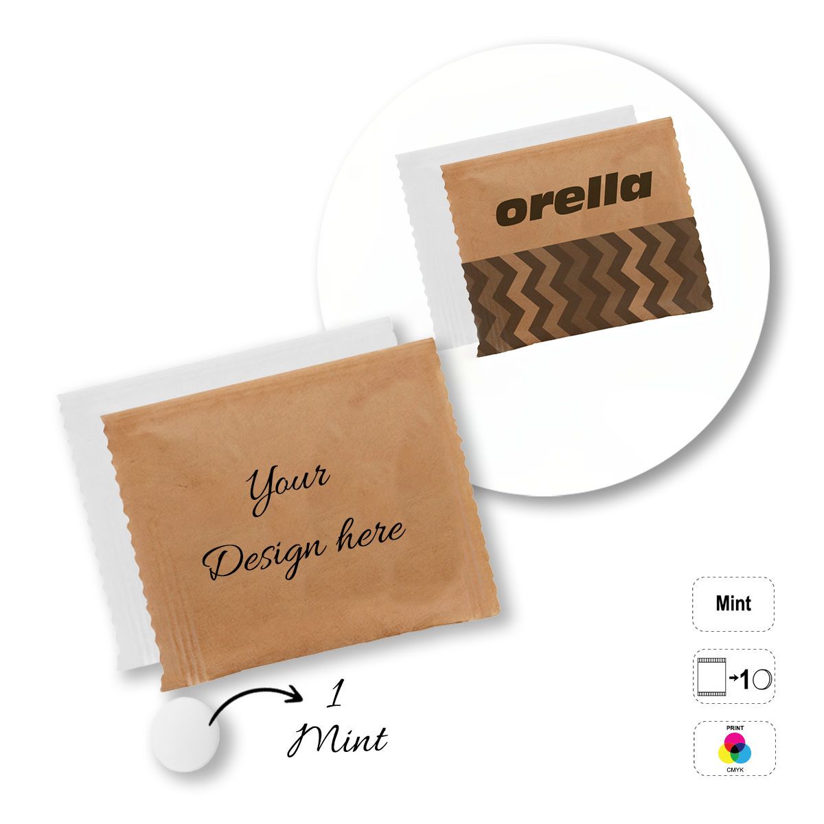 Rectangular sachet containing chewable mints. The letters in the product code correspond to the number of mints inside: A- 1 mint, B- 2 mints, C- 3 mints. Fully customisable food sachet with a choice of: 100% compostable white or transparent sachet or white or kraft paper (choice of finish when ordering). Minimum shelf life - 12 months.
