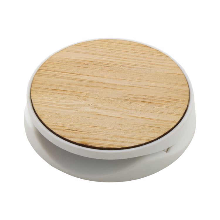 Bamboo covered, round shaped, plastic mobile holder with self-adhesive base.
