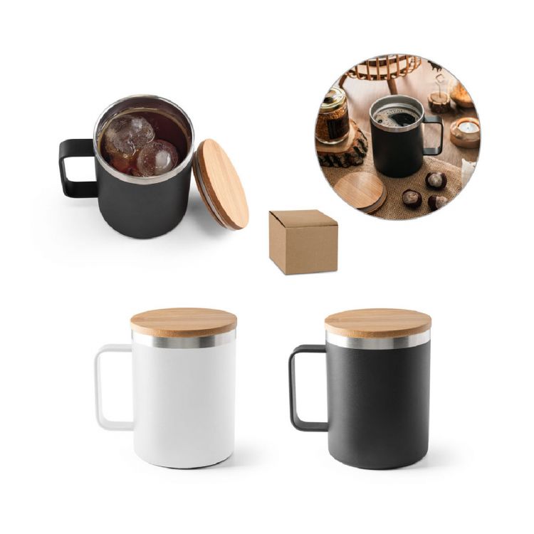 Vacuum insulated ouble walled mug in stainless steel (90% recycled) with a bamboo lid. This mug has a powder coating that makes it more durable and resistant. Capacity up to 420 mL. Supplied in a Kraft gift box. As the product is made from natural materials, the colour and the printing result may vary between products