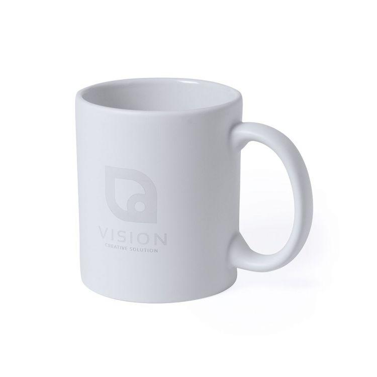 High quality 350ml ceramic mug. Outside part in white, especially designed for laser printing, and inside in bright tones. When engraving the logo on the outside, the color of the inside of the mug is shown. Presented in an individual box.Instruction manual available in Spanish and English.