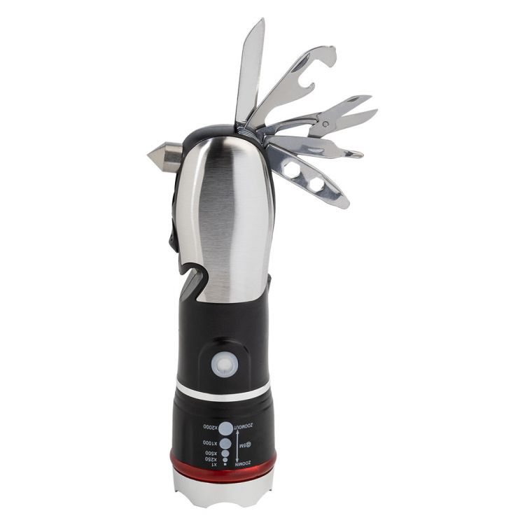 ABS and stainless steel multifunctional flashlight with emergency hammer, seat belt cutter and multi tool with 9 functions. With zoomable LED light and 3 light modes. Operates with 3 AAA batteries, without batteries