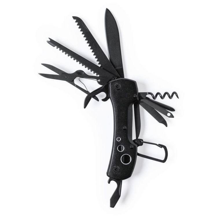 Multi-purpose knife with accessories in stainless steel with black finish. Matching resistant aluminium handle with integrated carabiner. 13 functions, including knife, screwdriver, file, opener, and scissors. Foldable and compact in size, presented in an individual box in black design. (black color)
