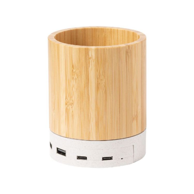 Multifunctional pen holder in bamboo and ecological wheat straw plastic. With mobile phone holder, wireless charger (5W) and 3-port USB hub (2 USB and 1 USB-C ports, USB 2.0). Including USB charger cable