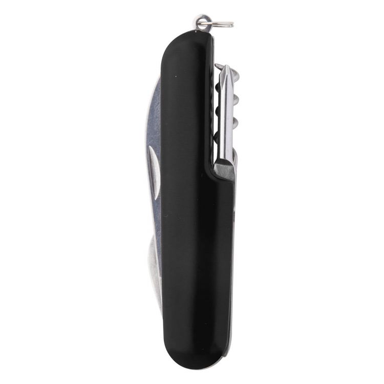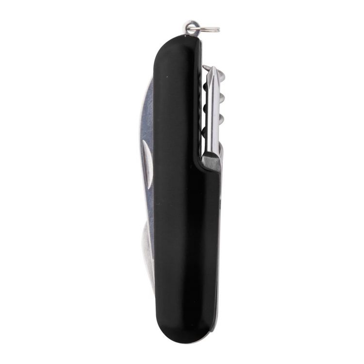 Stainless steel pocket knife with 5 functions and aluminium handle.