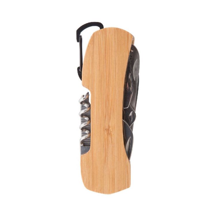 Stainless steel pocket knife with carabiner, bamboo handle and 9 functions
