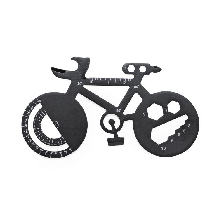 Handy and useful multi-tool in stainless steel, bicycle shaped. With 16 functions, among others: flat and philips screwdriver, spanner for hexagon nuts in different sizes, ruler, angle protractor and bottle opener. Presented in a Recycled paper bag. (black color)
