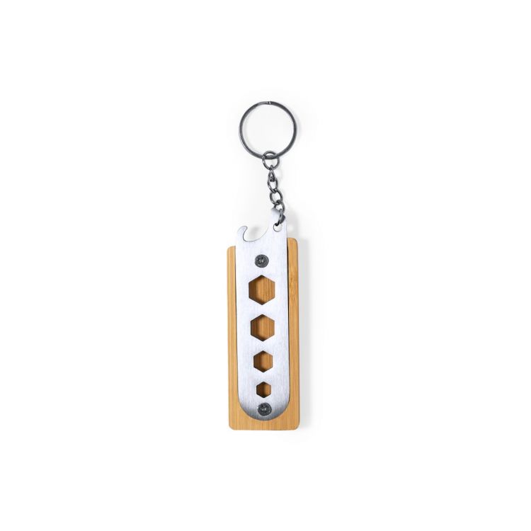 Multi-tool key ring made in durable stainless steel and bamboo. With practical set of 4 hexagon spanners and bottle opener. Presented in an individual kraft design box. (neutral color)