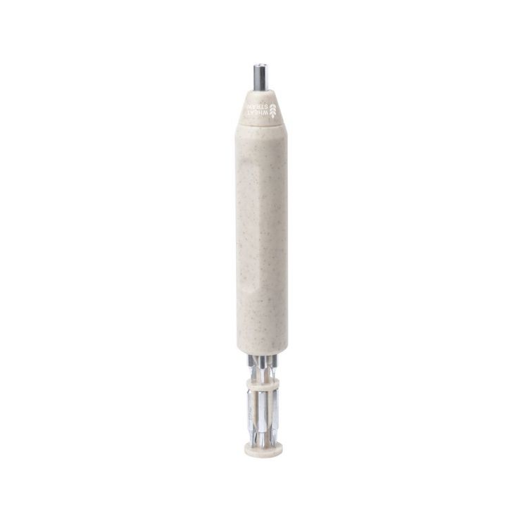 Practical multi-tool made of wheat straw in the shape of a screwdriver. Including a compartment inside the handle for storing multiple magnetic bits (flat and philips). With a wheat straw logo included and presented in a kraft design box.Wheat straw promotes the use of natural raw materials, thus reducing pollutant emissions. (neutral color)