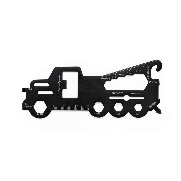 Cool and practical stainless steel multi-tool in the shape of a truck. With 18 functions, among others: flat and philips screwdriver, hexagon spanner in various sizes, ruler, box opener and bottle opener. Presented in a Recycled paper bag. (black color)