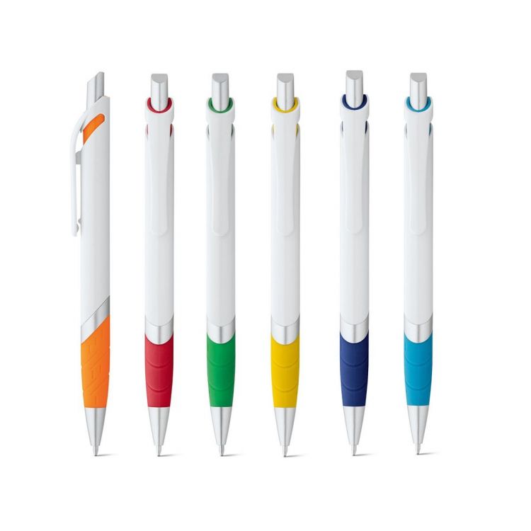 ABS ball pen with clip and coloured non-slip grip. Blue ink