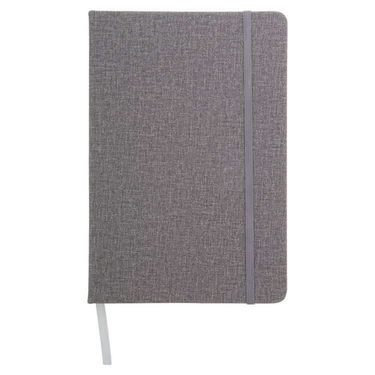 Textured PU leather covered notebook with rubber strap and 80 lined sheets. A5 size
