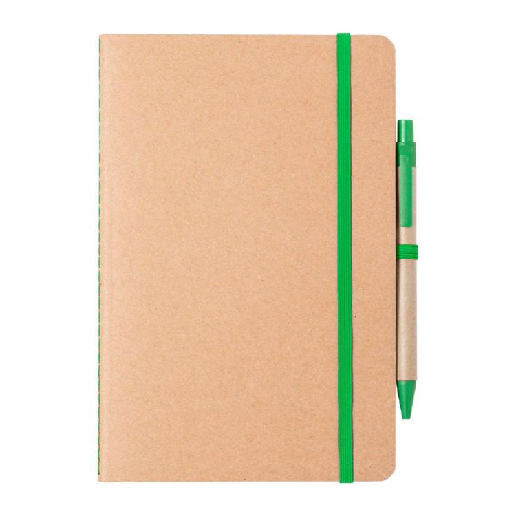 Recycled cardboard covered notebook with 60 blank sheets and coloured rubber strap, A5 size. Including wheat straw plastic ballpoint pen with blue refill.