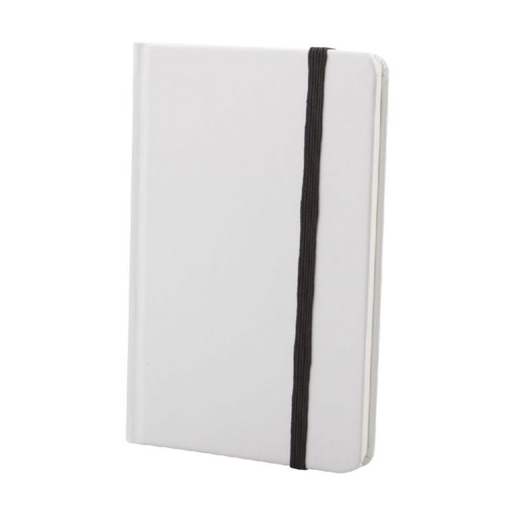 White carton covered notebook with 80 blank sheets and coloured rubber strap. A6 size.