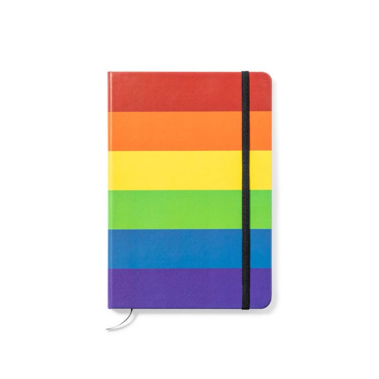 Multicoloured Rainbow notepad, with soft touch PU leather hard covers and elastic band. A notebook to be proud of, with 100 plain sheets inside and fabric bookmark. (multicolor color)
