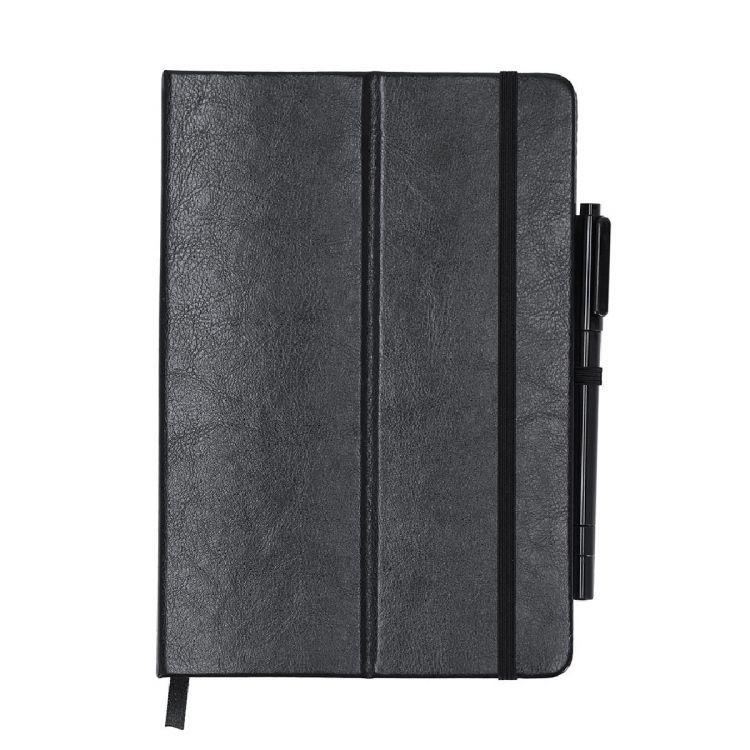 Blackboard notepad in recycled PU. With a blackboard on the first page, it includes a marker pen and eraser in black ink. With 80 sheets available in a stripe. Foldable cover with support function, and elastic band for secure closure. Ideal for taking quick notes, notes, creating designs in your workday or at home. Includes distinctiveov PU Recycled logo. (black color)