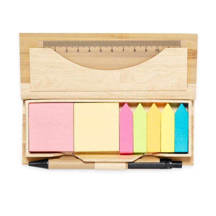 Useful office set made of bamboo. This box includes 220 sticky notes of 4x4.5 cm in two colours, 550 mini arrow-shaped sticky notes of1.2x4.5 cm in five vibrant colours, a 12 cm ruler and a ball pen made of recycled cardboard with blue ink. Presented in an individual recycled bag.Materials such as bamboo promote the use of natural raw materials, thus reducing pollutant emissions. It comes from a highly resistant and versatile plant, with rapid growth and regeneration, making it an excellent alternative to the use of traditional wood. (neutral color)