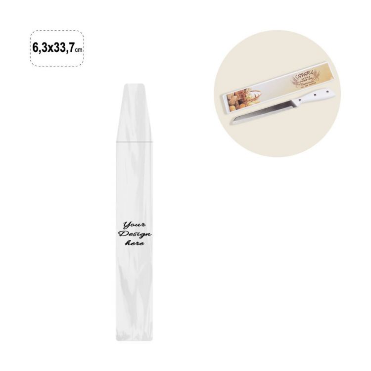 Long envelope made of transparent PVC with opening on the short side for the insertion of paper insides, re-sealable with flap.
