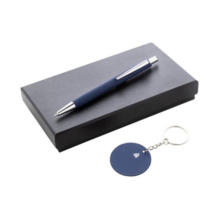 2 piece gift set in black paper gift box. Including recycled aluminium ballpoint pen with rubberized finish and blue refill, and recycled stainless steel keyring with rubberized finish. Both items feature special coating for mirror laser engraving.