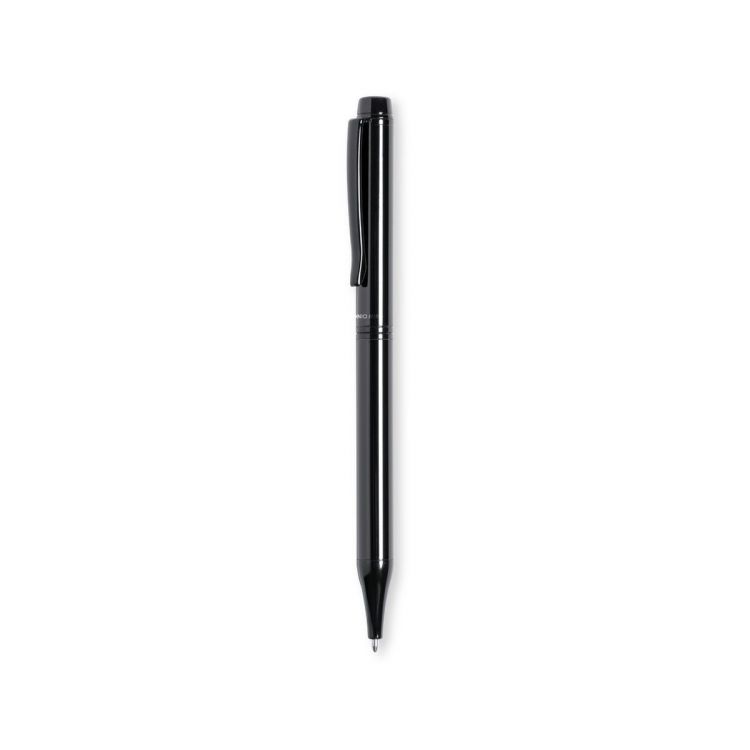 Antonio Miró ball pen made in shiny metal, with brand logo on the barrel and available in a wide range of colors. With twist mechanism and in blue ink. Presented in an elegant and resistant black individual box with Antonio Miró logo and matching sleeve.
