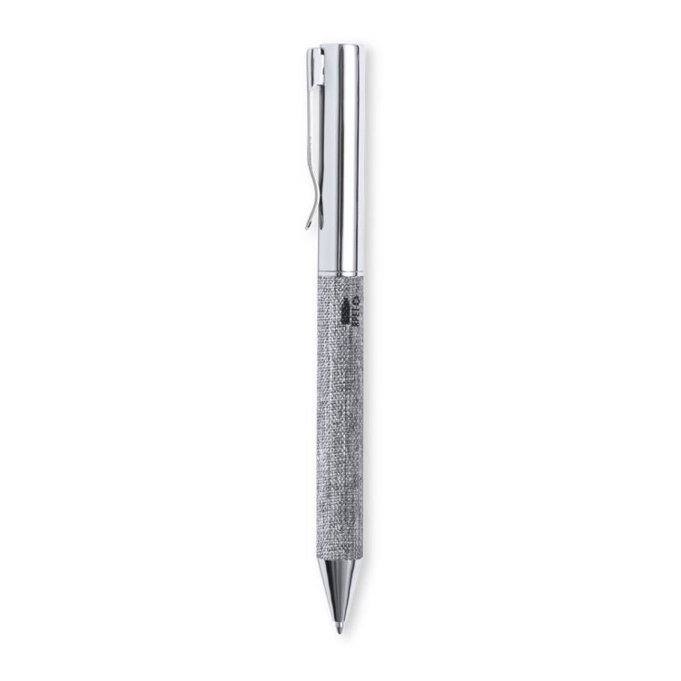 Ball pen made in chrome-plated metal, with RPET polyester coated barrel, made from recycled plastic to encourage the reuse of plastic waste and help the sustainability of the planet. Stylish metal clip and matching accessories, twist mechanism and blue ink. With RPET distinctive on the barrel and presented in a kraft case with matching sleeve. (silver color)