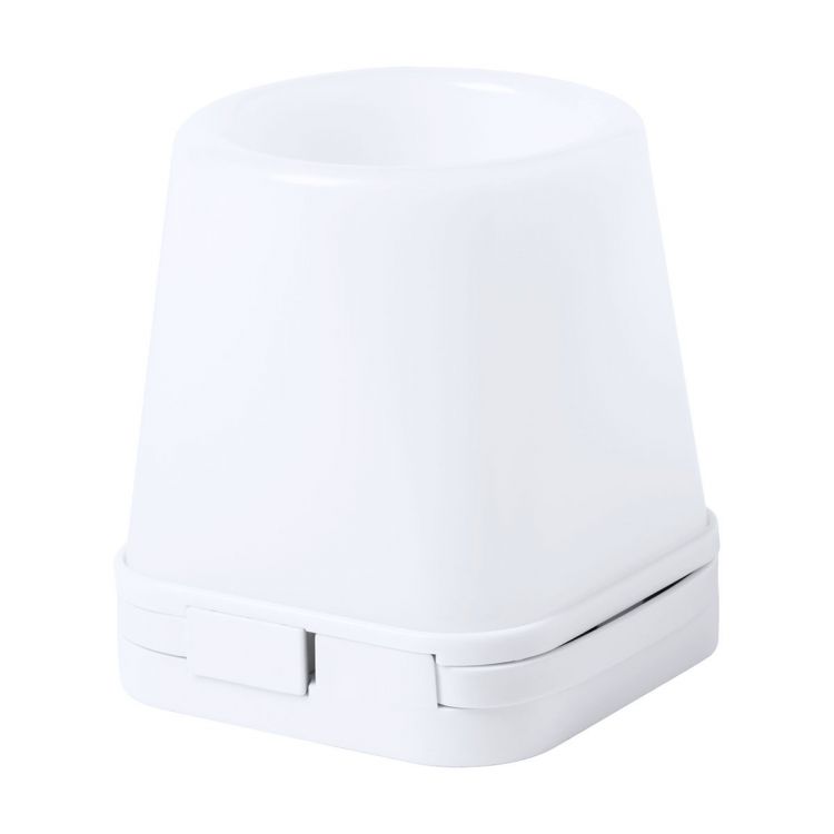 Plastic pen holder with 4-port USB hub, built-in mobile holder and 4 LED lights. USB 2.0, in white color