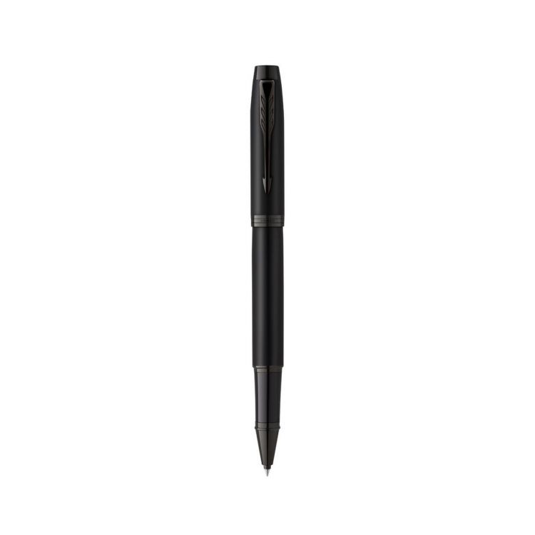 Roller Parker IM Achromatic, made of stainless steel with a matte black lacquered finish and black ink. It features black accents and the unmistakable clip with the brand's iconic arrow-shaped tip on the cap. It has an elegant, refined design with proven effectiveness, complemented by a modern silhouette. Presented in a black individual case with the Parker logo.. Parker IM is the entry-level range into the Parker universe, crafted with attention to every detail and designed for daily intensive use. It uses Parker Quink ink, which provides smooth and reliable writing on paper. (black color)