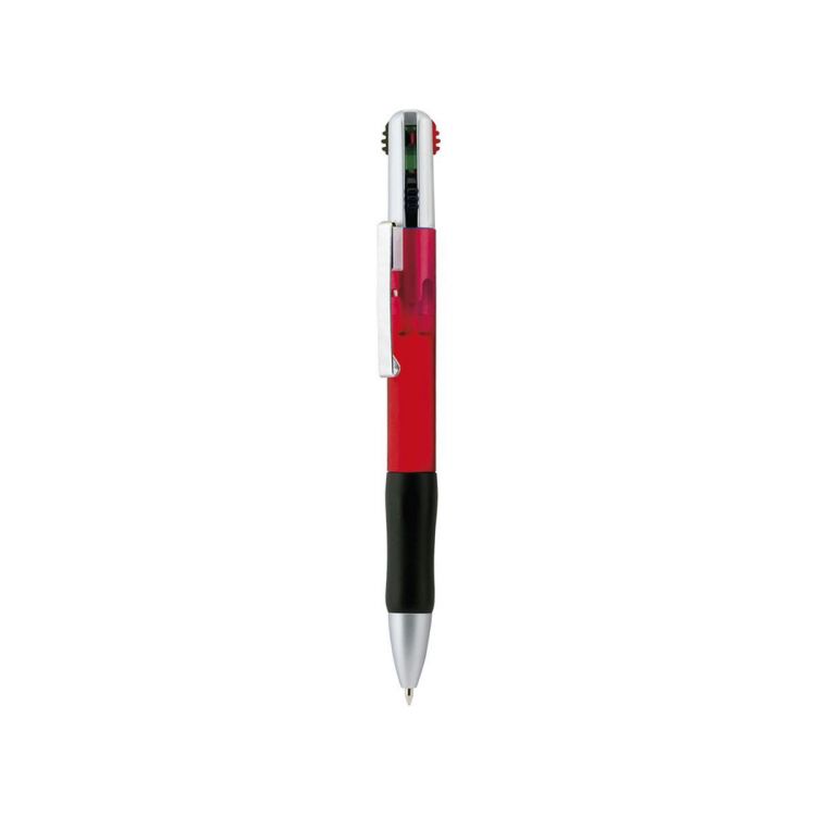 4-in-1 ball pen with retractable push-up mechanism, classic design and body with soft translucent finish in vivid colors. With silver details and soft ergonomic grip in black. 4 cartridges in blue, red, black and green inks.