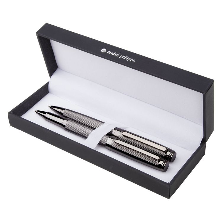 Elegant, metal ballpoint pen and roller pen set with patterned barrel. In black gift box, with blue refill. André Philippe brand product