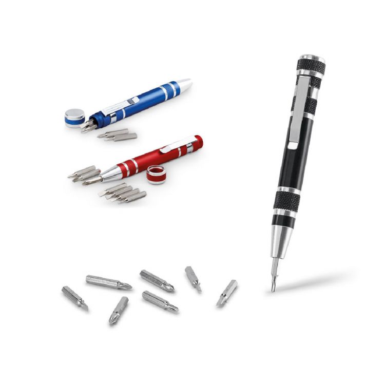 Pen shaped screwdriver set with 8 different removable tips. Practical tool with clip and the option to store all the components on the upper part of the body with lid. Supplied in a gift box