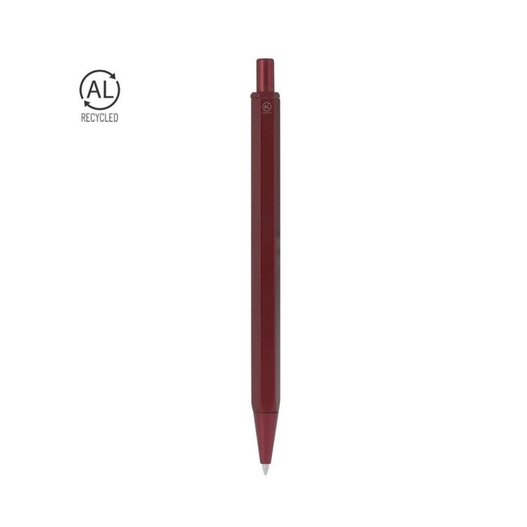 Elegant pen made from recycled aluminum. Body in distinguished hexagonal shape. Push mechanism made from recycled ABS and blue ink. With distinguished logo of recycled aluminum embossed on the body.Recycled aluminum is a material with almost infinite recycling possibilities, without losing its original properties and consuming less energy in this process.GRS certification (Global Recycled Standard), which guarantees the recycled origin of the material used to manufacture the product.RABS is a highly recyclable plastic of great durability with numerous applications, making it an eco-friendly solution. With RCS certification, which guarantees its recycled origin and RABS logo engraved.
