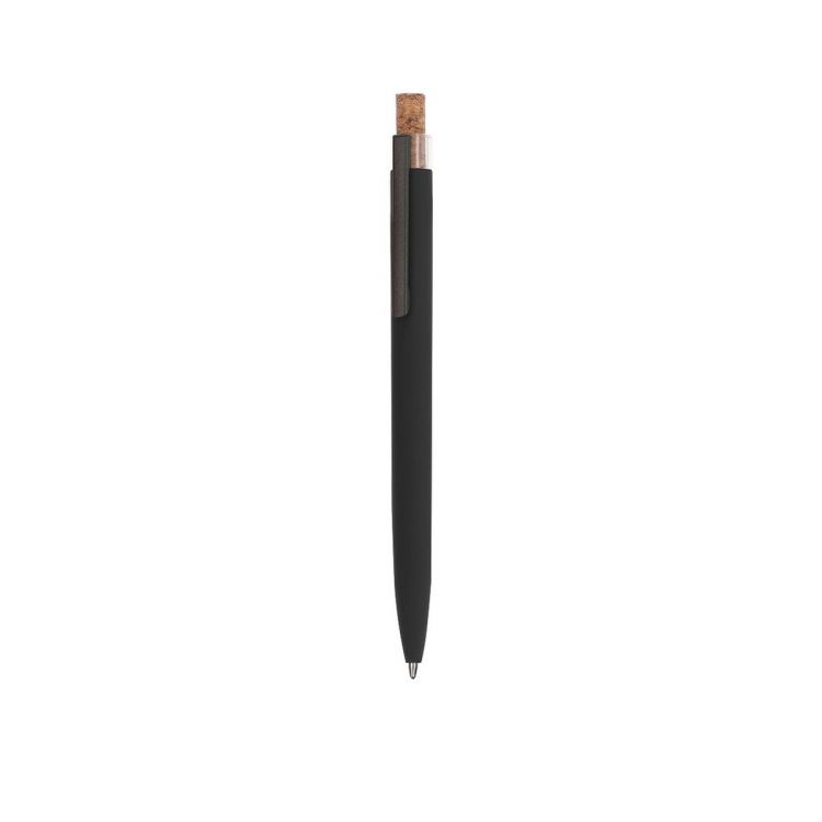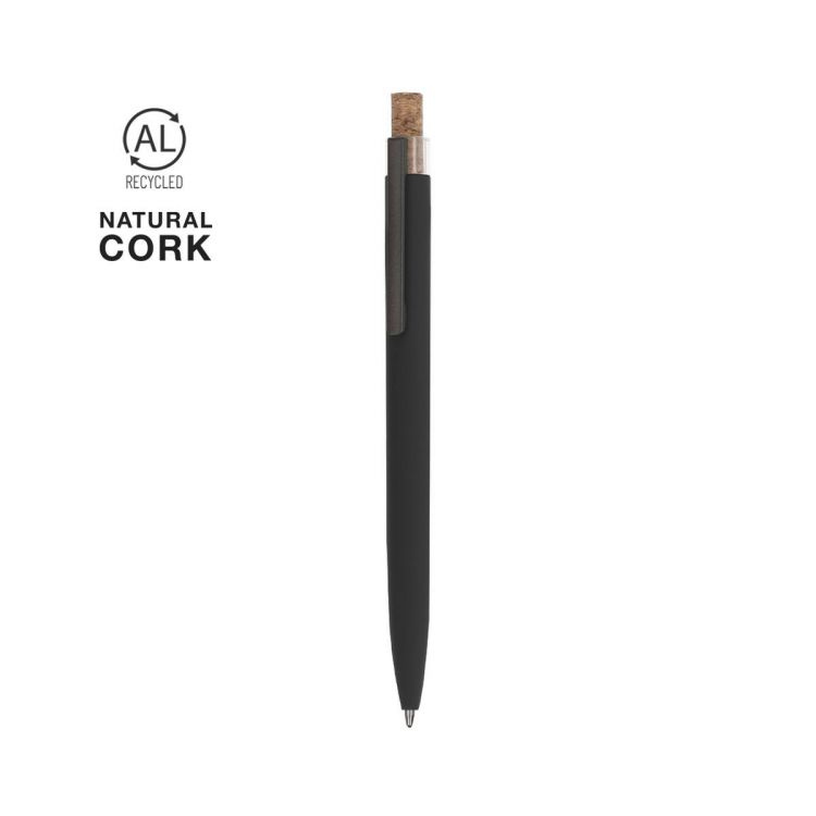 Push mechanism pen made of recycled aluminum. Cork push button and rubber finish body, specially designed for laser marking. Metal clip and recycled aluminum label on the top of the pen. Jumbo cartridge and blue ink.Recycled aluminum is a material with nearly infinite recycling possibilities, without losing its original properties and consuming less energy in this process.GRS certification (Global Recycled Standard) guarantees the recycled origin of the material used to manufacture the product.