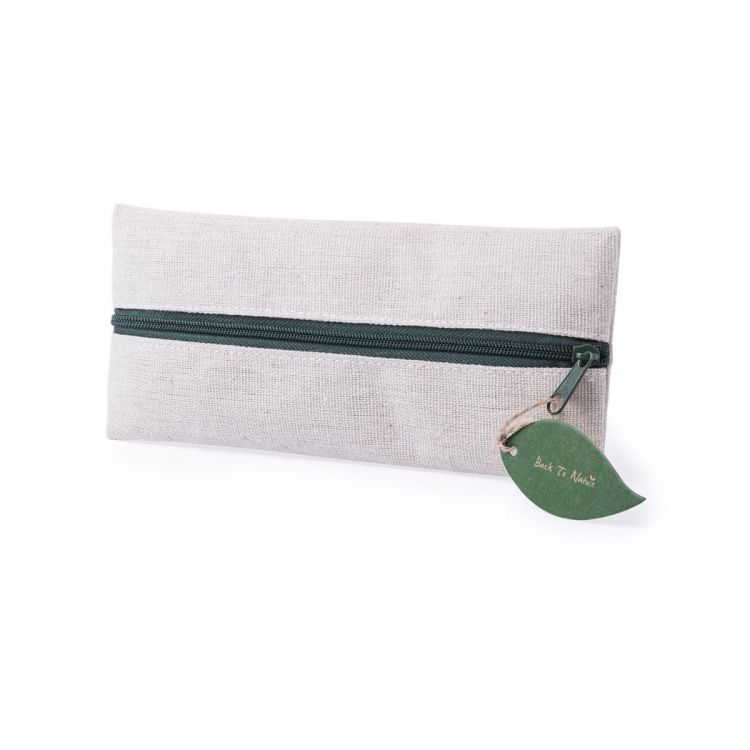 Handy, natura line case. Compact size, in combination of materials jute and cotton. Zipper closure and logo leaf in puller. (neutral color)