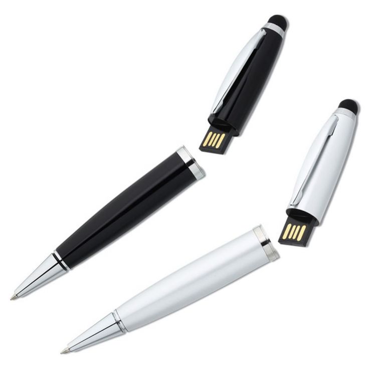 Metal USB pen drive 1, 2, 4, 8, 16, 32 GB. It's both USB drive and pen, and it has also a rubber tip for touchscreen devices.