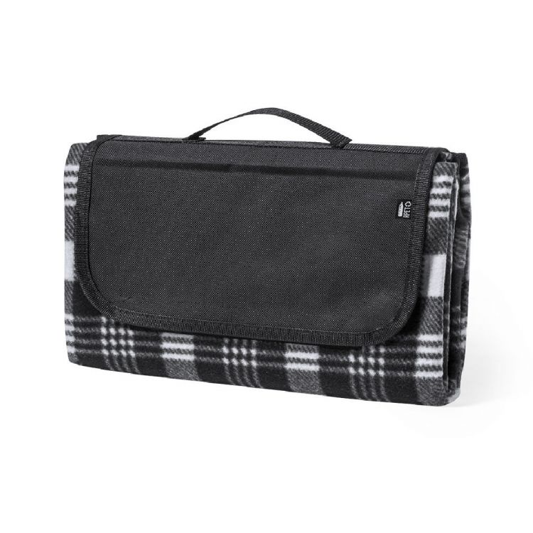 Premium quality picnic blanket in 160g/m2 RPET polyester, made from recycled plastic to encourage the reuse of plastic waste and contribute to the sustainability of the planet. Size 120x150cm, with a soft-touch, two-tone tartan pattern on the sitting side. Floor side in durable PEVA. Easy to fold and compact in size, including carrying handle and flap with velcro closure, with RPET emblem on label.)