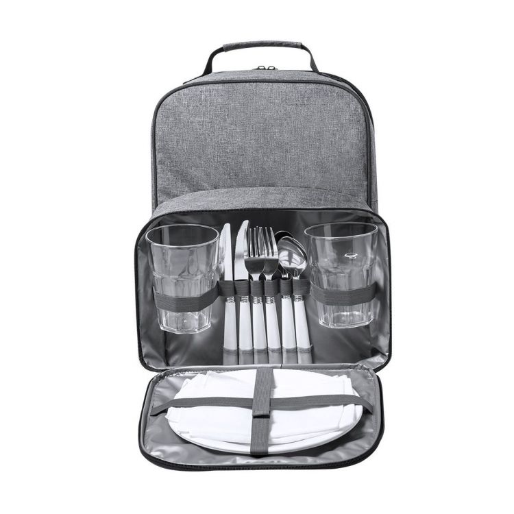 Nature line picnic cooler backpack, made in durable, high quality 600D RPET, produced from recycled plastic to encourage the reuse of plastic waste and contribute to the sustainability of the planet. Ideal for 2 people, with separate pocket for safe storage. Includes 2 glasses, 2 knives, 2 spoons, 2 forks, 2 plates and 2 napkins. Cooler compartment with PEVA inside and comfortable carrying handle. Padded straps and padded back. RPET distinctive on label. (grey color)