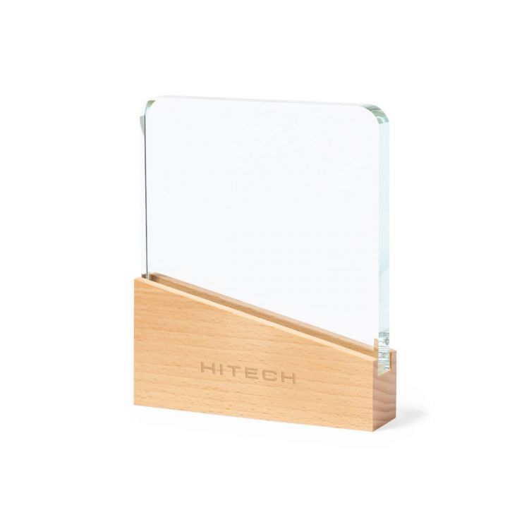 Commemorative plaque made of thick and resistant glass, with a natural wood base. Presented in a kraft protective case, with magnetic closure and foam inside. (neutral color)