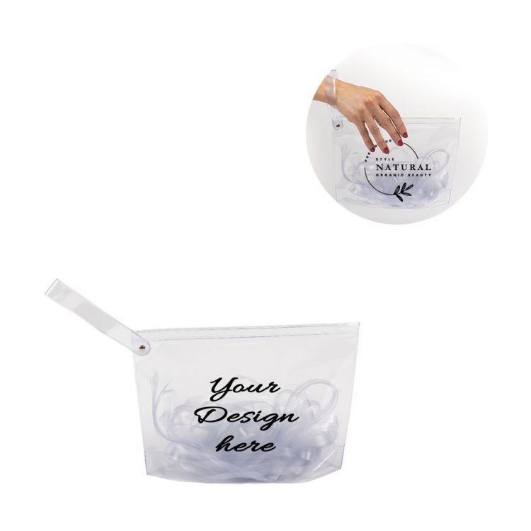 Small wrist pouch , made of transparent soft PVC, with gusset at the base, plastic closing rail and plastic slider. Suitable for bottles and small containers.